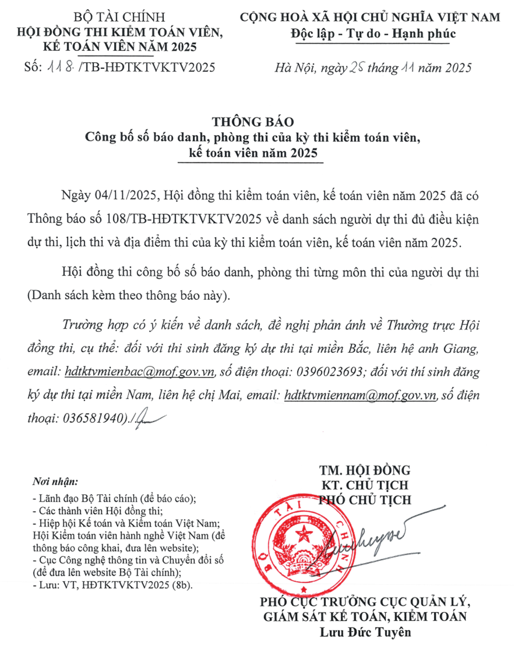Bộ Tài chính thông báo về kỳ thi kiểm toán viên và kế toán viên năm 2025 (CV số 118/TB-HĐTKTVKTV2025 ngày 25/11/2025)