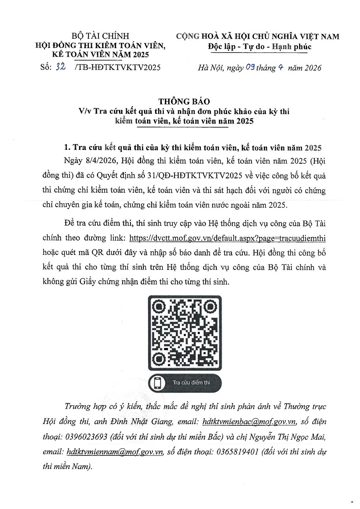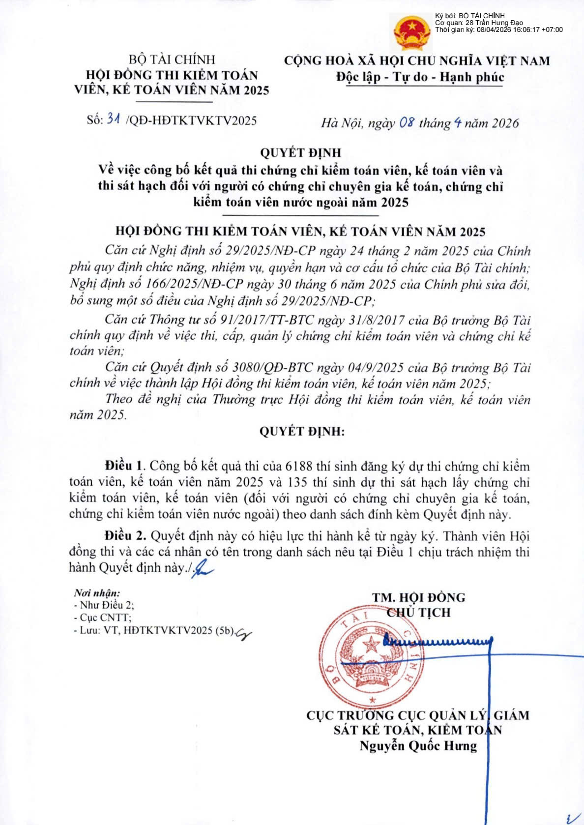 Hội đồng thi kiểm toán viên, kế toán viên năm 2025 công bố kết quả thi chứng chỉ kiểm toán viên, kế toán viên...